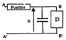 Déterminer la puissance électrique moyenne P absorbée par ce dipôle. P =Ue Ie cos(F). En déduire l'expression P= R(Ue/Z)2, R étant la résistance du dipôle. cos F = R / Z ; Ie = Ue/ Z. Par suite P= Ue Ue/ Z R / Z = R(Ue/Z)2. Un fusible protège une ligne électrique [AB, A'B'], alimentant en régime sinusoïdal sous la tension efficace Ue = 220 V et la fréquence f= 50 Hz un dipôle D assimilable à une bobine d'inductance L=30 mH en série avec un résistor R. L'intensité efficace maximale admissible dans la ligne est 16 A. Ce dipôle absorbe une puissance moyenne P= 2,5 kW. La ligne se comporte comme un conducteur ohmique de résistance totale R0 = 1,2 W fusible compris.