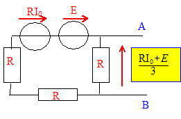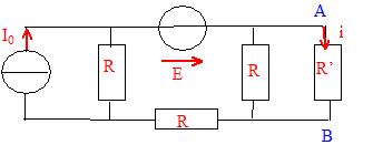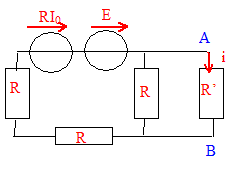La fem Et du générateur de Thévenin est égale à : Et = (RI0+E) /3. Intensité du courant circulant dans R' :