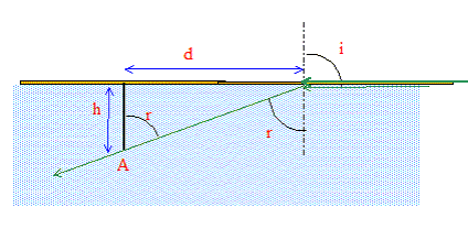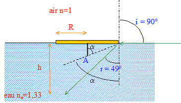 loi de Descartes : 1 = 1,33 sin r soit r = 48,75° De plus tan r = d/h ; tan 48,75 = 1,140 ; d= h tan r = 5*1,14 = 5,7 cm. L'observateur situé à une distance inférieure à 5,7 cm du centre du disque "transparent" peut voir le point A.