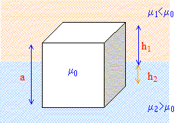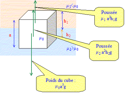 Un cube de coté a et de masse volumique m0 est immergé entre deux liquides de masse volumique respective m1 et m2. Déterminer les hauteurs h1 et h2 d'immersion dans les liquides lorsque le cube est à l'équilibre. A.N : a = 5 cm ; m1 =0,7 kg L-1 ; m0 =0,8 kg L-1 ; m2 =1 kg L-1.