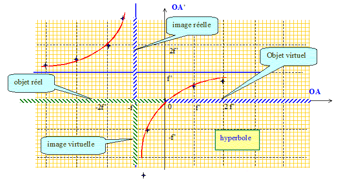 Soit une lentille mince convergente de centre O. On note F et F' ses foyers objet et image respectifs. Préciser le signe de OF'. Pour une lentille convergente la distance focale image OF' est positive ( F' à droite de O). Donner la relation de conjugaison avec origine aux sommet pour un couple de points conjugués sur l'axe optique A et A'. 1/OF' = 1/OA' - 1/OA. On cherche à traduire la relation de conjugaison par une courbe dans le plan ( OA ; OA' ) où l'abscisse est OA et l'ordonnée OA'. Où se situe l'image d'un objet ponctuel placé au foyer principal objet F ? 1/OA = -1/OF' La relation de conjugaison conduit à 1/OA' =0, c'est à dire une image rejetée à l'infini. Où se situe l'image d'un objet ponctuel qui serait à l'infini sur l'axe ? L'image d'un objet réel situé à l'infini sur l'axe se trouve au foyer principal image. En déduire que le graphe que l'on recherche admet deux asymptotes que l'on caractérisera. Tracer la relation de conjugaison. Quel type de courbe reconnaissez vous ? Quelques valeurs : ( f' : distance focale image )