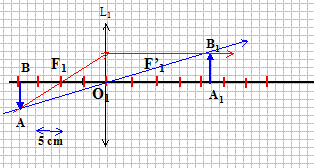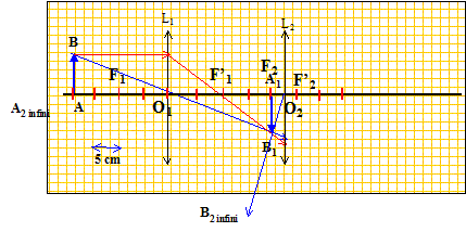 On suppose l'oeil placé contre la lentille L2. Même calcul que ci-dessus. L'oeil accomode au maximum : l'image définitive virtuelle A2B2 est à 12,5 cm à gauche de F'2. O2A2 = -12,5 cm = -0,125 m. Appliquer la formule de conjugaison à la lentille L2. 1/O2F'2 = 1/O2A2 - 1/O2A1. 1/O2A1 = 1/O2A2-1/f'2 = 1/(-0,125) - 1/0,02 = -8-50 = -58 ; O2A1 = -1/58 =-0,01724 m = -1,72 cm. O1A1 = O1O2 +O2 A1=22-1,724 = =20,276 cm = 0,2028 m. Appliquer la formule de conjugaison à la lentille L1. 1/O1F'1 = 1/O1A1 - 1/O1A. 1/O1A = 1/O1A1-1/f'1 = 1/0,2028- 1/0,1 =4,932-10 = -5,068 ; O1A = -1/5,068 =-0,1973 m = -19,7 cm. |