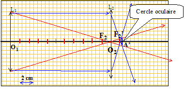 Appliquer la formule de conjugaison à la lentille L2. L'objet est la lentille L1. 1/O2F'2 = 1/O2A' - 1/O2O1. 1/O2A' = 1/f'2 + 1/O2O1 = 1/0,02 + 1/(-0,22) = 50-4,545 = 45,45 ; O2A' = 1/45,45 = 0,022 m = 2,2 cm. Position du cercle oculaire : 2,2 cm à droite de L2. Grandissement transversal : g = O2A' / O2O1 = 2,2 / (-22) = -0,1. diamètre du cercle oculaire : 0,1 d1 = 0,1*3 = 0,3 cm = 3 mm.