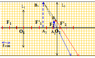 L'oeil accomode au maximum : l'image définitive virtuelle A2B2 est à 12,5 cm à gauche de F'2. O2A2 = -(12,5-2 =) = -10,5 cm = -0,105 m. Appliquer la formule de conjugaison à la lentille L2. 1/O2F'2 = 1/O2A2 - 1/O2A1. 1/O2A1 = 1/O2A2-1/f'2 = 1/(-0,105) - 1/0,02 = -9,52-50 = -59,52 ; O2A1 = -1/59,52 =-0,0168 m = -1,7 cm. O1A1 = O1O2 +O2 A1=22-1,68 =20,32 cm = 0,203 m. Appliquer la formule de conjugaison à la lentille L1. 1/O1F'1 = 1/O1A1 - 1/O1A. 1/O1A = 1/O1A1-1/f'1 = 1/0,203- 1/0,1 =4,92-10 = -5,08 ; O1A = -1/5,08 =-0,197 m = -19,7 cm. La profondeur de champ est la distance, mesurée sur l'axe optique, qui sépare les positions extrêmes de l'objet pour lesquelles on peut considérer que l'image qui se forme sur un écran fixe ( l'oeil ) est nette. Donc région comprise entre 20 cm et 19,7 cm à gauche de L1.