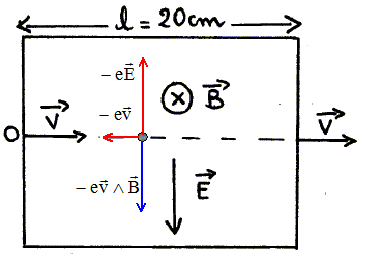 Les vecteurs sont écrits en gras et en bleu. Un faisceau d'électrons pénètre en O dans une région de longueur l=20 cm où règne un champ électrostatique uniforme de module E = 2 104 V/m et un champ magnétique uniforme B perpendiculaire à E.