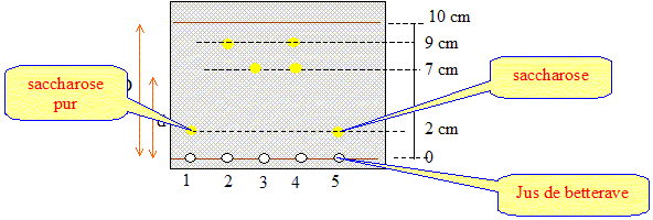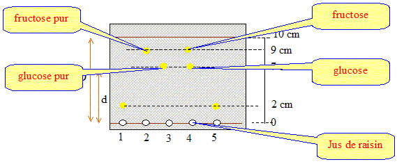 substance de référence ( étalon) 1 : saccharose ; 2 : fructose ; 3 : glucose 4 : jus de raisin ; 5 : jus de betterave. Dans le jus de raisin on identifie :