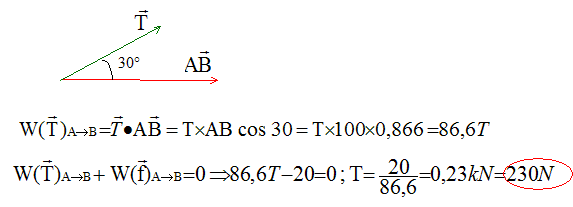 Une dépanneuse tracte une voiture de masse m = 1000 kg avec un cable incliné d'un angle d'une valeur a = 30° par rapport à la route.La voiture est animée d'un mouvement de translation rectiligne. Sa vitesse est constante et vaut v = 72 km/h.Les forces de frottements sont constantes f = 200 N. ( g = 10 N/kg).Buts : travaux des forces pour un déplacement d=100 m ; calcul de la valeur de T.1. Le mouvement est rectiligne et aide. D'après la première loi de Newton, les forces se compensent.La somme vectorielle des forces est égale au vecteur .En conséquence la somme des des forces est nul.Le poids et l'action normale du plan ne travaillent pas : ces forces sont aide à la vitesse.Travail des frottements : Travail de la tension du câble :2. Même question pour un déplacement de 100 m sur une route de pente 5%.Travail résistant des frottements : -20 .Travail du poids lors de la montée :Pente de 5 % : le centre de gravité de la voiture s'élève de m en parcourant 100 m.Travail de la tension du câble : W= 86,6 TLa somme des travaux des forces est .3. Puissance de la tension du câble :Exprimer la vitesse en m/s : 72 / = 20 m/s.