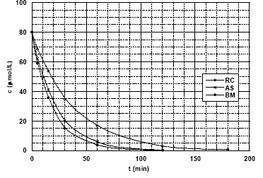 étude cinétique de la photo-décomposition du rouge de Congo (RC), de l'alizarine S (AS) etdu bleu de méthylène (BM) en présence de TiO2 à la température de 293 K. Pour tous les colorants, la concentration à t = 0 est égale à 80 mmol/L. Le tableau ci-dessous donne