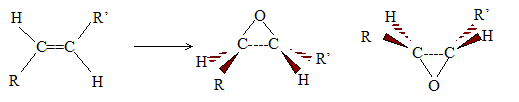 L'acide métachloroperoxybenzoïque ( m-CPBA), le dioxygène en présence de catalyseur à base d'argent, permettent de passer d'un alcène à l'époxyde. Le pont "oxygène se forme soit au dessus du plan de la double liaison, soit en dessous : en conséquence, à partir de l'alcène suivant, plusieurs énantiomères sont obtenus.