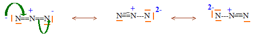 La molécule CO2 et un ion NO2+ sont isoélectroniques de N3-. La structure de Lewis proposée pour N3- ( symétrie par rapport à l'azote central ) est en accord avec la longueur identique des liaisons. Par contre une disymétrie de structure entraîne des longueurs de liaisons différentes ; écrivons les formules mésomères pour l'ion azoture :