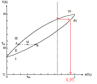 Distillation fractionnée de l'air liquide : Le changement d'état des mélanges binaires O2 - N2 s'étudie grâce au diagramme isobare ( P= 1 bar) d'équilibre liquide-vapeur suivant :