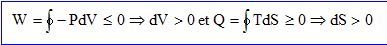 La variation d'entropie est nulle sur le cycle : DS=0 ; par suite Q/Tsource <=0 soit Q<=0 La variation d'énergie interne est nulle sur le cycle : DU=W+Q=0 ; d'où W=-Q Q