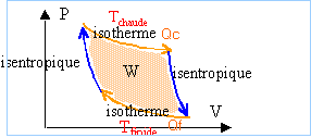Sur le cycle, le 2ème principe s'écrit : DS=0 soit Qf/Tf+Qc/Tc<=0, relation vérifiée si Qc>0 et Qf<0, Tf étant inférieure à Tc. rendement h= |W| /Qc =(Qf+Qc)/Qc = 1 +Qf /Qc avec dans le cas de la réversibilité : Qf/Tf+Qc/Tc=0 ; Qf /Qc = -Tf /Tc ; par suite h= 1-Tf /Tc. Le rendement est d'autant plus proche de 1 que l'écart des températures est grand. Ce moteur manque de puissance car il met en jeu des processus isothermes qui sont lents.