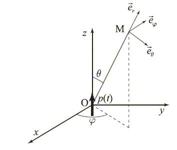 Le dipôle ( deux charges +q et - q situées à la distance d ) est équivalent à un élément de courant ldq/dt ez = dp/dt ez. Tout plan contenant l'axe Oz est plan de symétrie. Le champ électrique est dans le plan défini par Oz et eq. Le champ magnétique créé