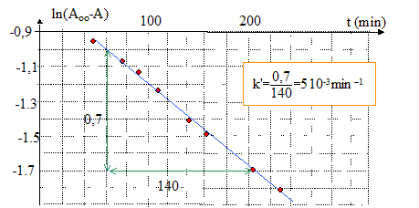 dA/dt =- k'(A- Aoo) ; dA /(A- Aoo) = -k' dt par intégration : ln(A- Aoo) = -k't + constante ; à t=0 , A=A0. d'où : ln[(A0- Aoo) /(A- Aoo)] = k't ; ln[(Aoo- A0) /(Aoo- A)] = k't ; ln (Aoo-A) = -k't +ln (Aoo-A0) tracer le graphe ln (Aoo-A) = f(t) ; droite de pente k'.