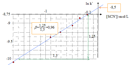 Rôle de la solution de perchlorate de sodium : elle garde constante la force ionique de chaque solution. Ordre partiel de la réaction par rapport à SCN- : k'= k [SCN-]b ; ln k' = ln k + b ln [SCN-] tracer la courbe ln k' = f([SCN-]) ; droite de pente b et d'ordonnée à l'origine ln k.