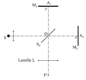 Les interférences à deux ondes sont produites par des dispositifs à division du front d'onde ou des dispositifs à division d'amplitude. Un interféromètre de Michelson est constitué d'une lame semi-réfléchissante, non absorbante, appelée séparatrice Sp dont les facteurs de transmission et de réflexion sur les amplitudes valent ½ et de deux miroirs plans M1 et M2 perpendiculaires l'un à l'autre. L'interféromètre est plongé dans l'air d'indice 1,0000. On utilise comme source étendue une lampe spectrale de symétrie de révolution autour de l'axe SO parallèle à l'axe Ox. On observe en lumière monochromatique dans le plan focal d'une lentille mince convergente L d'axe optique Oy et de distance focale f' = 1,0 m.