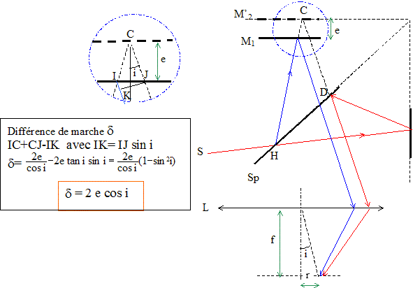M'2 image de M2 donnée par Sp : M'2 et M2 sont symétriques par rapport à Sp. En conséquence HB= HC et BD= CD. L'interféromètre est donc équivalent à une lame d'air d'épaisseur e= M1M'2. Les rayons réfléchis émergents sont parallèles ; ces derniers interfèrent à l'infini. L'image d'un objet à l'infini se trouve dans le plan focal image de la lentille convergente. La symétrie du dispositif conduit à des franges d'interférences qui ont la forme d'anneaux d'axe de révolution Oy. Calcul du rayon du premier anneau brillant correspondant à l = 434,1 nm.