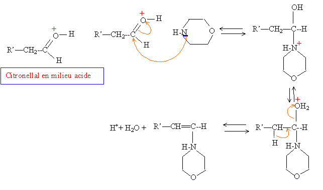 prévisibles. Dans le cas de l'action d'une amine secondaire sur un aldéhyde ou d'une cétone, la déshydratation du produit intermédiaire d'addition obtenu fait intervenir la mobilité des atomes d'hydrogène portés par un carbone en a du carbonyle et conduit à une énamine. Le citronellal sera noté R'-CH2-CHO. En milieu acide l'énamine se protone sur l'un des deux atomes de carbone doublement lié. La forme protonée est stabilisée par résonance. L'hydrolyse de l'énamine en milieu acide en présence d'un large excès d'eau régénère le carbonyle et donne la forme protonée de la morpholine |