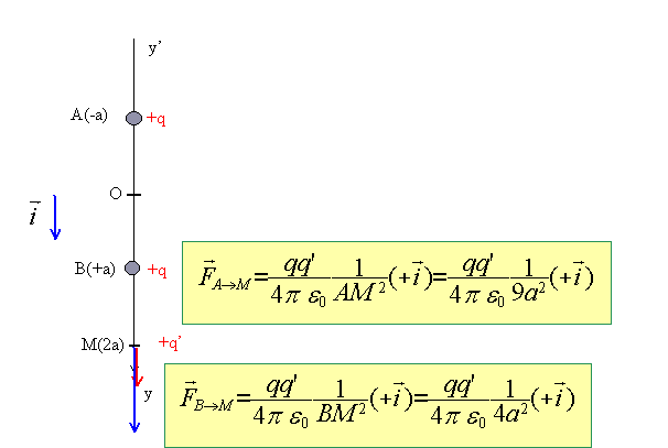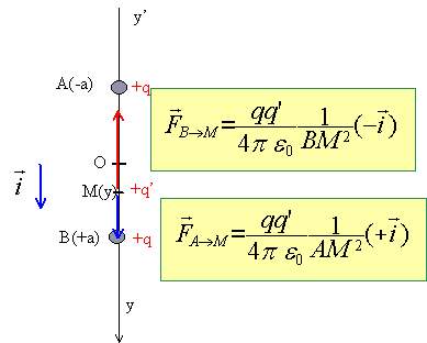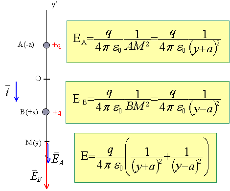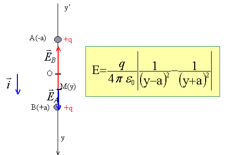 Deux charges ponctuelles positives q sont placées sur un axe y'Oy aux ordonnées -a et +a . Déterminer le potentiel V(y) et le champ électrique E (y) en tout point de l'axe y'Oy.