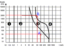 En absence de défaut, les deux bobines sont parcourues par la même intensité : lexcitation magnétique est nulle et en conséquence il n'y a pas de f.e.m induite dans la bobine du circuit de déclenchement. Il n'y a pas de déclenchement. En présence de défaut, les deux bobines sont parcourues par des intensités différentes : lexcitation magnétique n'est pas nulle et en conséquence il y a une f.e.m induite dans la bobine du circuit de déclenchement. Il y a déclenchement si l'intensité du courant traversant cette bobine de déclenchement atteint une valeur suffisamment importante. Ce système assure une bonne protection si la résistance de la " terre " est faible ; sinon lexcitation magnétique n'est pas assez grande pour induire une intensité assez importante dans la bobine de déclenchement. On relève sur deux disjoncteurs différentiels différents les indications "30mA " et " 500mA ". Il s'agit des courants de fuite induisant le déclenchement. Le disjoncteur le mieux adapté à la protection des personnes est "30 mA" : valeur sans danger pour une personne, mais suffisante pour induire un déclenchement. |