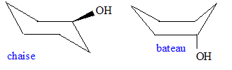 Le cyclohexanol, du fait de la symétrie de la molécule, ne possède pas d'énantiomères. Le cyclohexanol n'est pas plan. Les deux formes conformères majoritaires en solution à 25° C sont dessinées ci-dessous : la forme chaise est la plus stable.