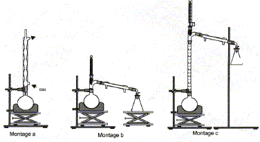Les deux couples rédox mis en jeu dans la réaction doxydation du cyclohexanol en cyclohexanone sont ClO- / Cl- et C6H10O / C6H12O. Demi équations rédox relatives à ces deux couples : ClO- +2e- + 2H+= Cl- + H2O. C6H12O = C6H10O + 2e- + 2H+ Equation qui modélise la réaction doxydation : ClO- +C6H12O = C6H10O+ H2O + Cl- Quantité de matière de cyclohexanol introduite : n1 = m/M = 10,0 / 100 = 0,100 mol Quantité de matière dions hypochlorite introduite : n2 =2,11*0,05 = 0,105 mol à partir de 0,100 mol de cyclohexanol il faut 0,100 mol d'ion hypochlorite ; or on en a 0,105 mol : ce dernier est en excès et le cyclohexanol est en défaut. Rendement de cette transformation : Qté de matière théorique de cyclohexanone : 0,100 mol masse théorique de cyclohexanone : 0,100* (6*12 + 10+16) = 9,8 g rendement = masse réelle / masse théorique * 100 = 6,8/9,8*100 = 69,4 %. On propose ci-dessous trois montages pour réaliser lhydrodistillation : il faut utiliser le montage b.