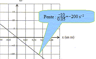 Enoncer en justifiant la relation traduisant l'équilibre de S dans le référentiel du laboratoire et exprimer k en fonction de m, g, L et L0. La masse fixée au ressort étant pseudo-isolée, tension et poids sont opposées ( principe d'inertie). Ces forces ont la même valeur. mg = k(L-L0). En déduire la valeur numérique de k. m = 100 g ; L0 = 400 mm ; L= 449 mm ; g = 9,8 N/kg. k = mg / (L-L0) = 0,1*9,8 /( 0,449-0,400 ) = 20 N m-1.