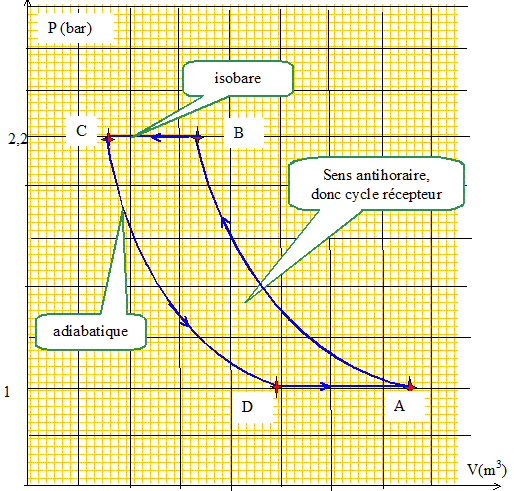 - une source froide constituée d'une nappa souterraine - le circuit de chauffage de l'installation qui constitue la source chaude. Le fluide utilisé dans cette pompe est l'air assimilable à un gaz parfait de capacité thermique molaire à pression constante Cp=29 J K-1 mol-1. R = 8,32 J K-1 mol-1. g = Cp/Cv = 1,4. L'air subit le cycle de transformations suivantes : Passage de l'état initial A à l'état B par une compression adiabatique réversible : PA = 105 Pa ; VA ; TA= 298 K ; PB = 2,2 105 Pa ; VB ; TB= 373 K. Passage de l'état initial B à l'état C par une transformation isobare : PC ; VC =0,0128 m3 ; TC= 340 K. Passage de l'état initial C à l'état D par une détente adiabatique réversible : PD ; VD =0,0225 m3 ; TD. Passage de l'état initial D à l'état A par une transformation isobare. Calculer VA,