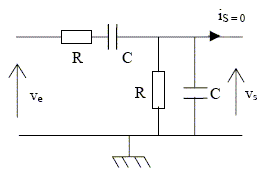 Admittance complexe des branches en dérivation : Y= 1/R + jCw = (1+RCw )/R Impédance complexe correspondante : Z1=R/(1+RCw) Impédance complexe de l'ensemble : Z = R+1/(jCw) + R/(1+RCw) H= vs /ve = Z1 / Z.