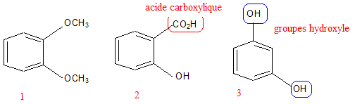 Pour 100 g de solution, la composition en substance active est : Levomenthol : 0,2600 g ; Vératrole : 0,2600 g ; Résorcinol : 0,0210 g ; Acide salicylique : 0,0105 g. Les autres composants sont l'huile essentielle de géranium, l'huile essentielle de cédrat, le jaune de quinoléine (E104). Toutes les espèces chimiques présentes dans le Synthol sont solubilisées dans un solvant à base d'éthanol à 96% et d'eau purifiée (titre alcoolique 34,5% en volume). Après une étude de quelques composés du Synthol, on vérifiera par un dosage la teneur en acide salicylique de la solution commerciale. Quelques composés du Synthol. On veut identifier les formules de l'acide salicylique, du résorcinol et du vératrole qui entrent dans la composition du Synthol. Sachant que l'acide salicylique est un acide carboxylique et que le résorcinol possède deux groupements hydroxyle, identifier les trois molécules en leur attribuant leur numéro.