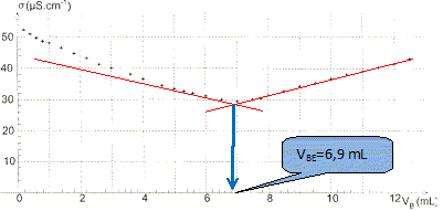 A l'aide des informations fournies sur la notice et des données ci-dessus, calculer la quantité de matière d'acide salicylique contenu dans un volume VA = 100,0 mL de Synthol. Masse de 100 mL de solution : VAr = 100 * 0,950 = 95,0 g. Pour 100 g de solution, la composition en substance active est : Acide salicylique : 0,0105 g. D'où la masse d'acide salycilique dans 95,0 g de solution : mA = 0,015*95/100 =9,975 10-3 g Quantité de matière d'acide salycilique : nA = mA /MA = 9,975 10-3 / 138 =7,228 10-5 ~ 7,23 10-5 mol. Vérifier que sa concentration est cA = 7,23 10-4 mol/L. concentration (mol/L) = quantité de matière (mol) / volume de la solution (L) cA =nA / VA = 7,23 10-5 / 0,100 = 7,23 10-4 mol/L. Préparation du dosage. Pour vérifier cette valeur, on souhaite effectuer un dosage acido-basique avec une solution d'hydroxyde de sodium (Na++ HO-). Le volume de Synthol dosé est VA = 100,0 mL. On admet que les calculs de concentration se conduisent pour la solution pharmaceutique de la même manière qu'en solution aqueuse. On écrit l'équation de la réaction support du dosage de la manière suivante : C7H6O3 + HO- = C7H5O3 - + H2O Après avoir donné la définition de l'équivalence, écrire la relation entre la quantité de matière d'acide salicylique ni(C7H6O3) et la quantité de matière d'ions hydroxyde n(HO-), qui permet d'atteindre cette équivalence. A l'équivalence les réactifs sont en proportions stoechiométriques ; avant l'équivalence, l'un des réactifs est en excès ; après l'équivalence, l'autre réactif est en excès. ni(C7H6O3) = cA VA ; n(HO-) = cB VB E avec cB concentration de l'hydroxyde de sodium et VB E volume d'hydroxyde de sodium ajouté à l'équivalence. cA VA = cB VB E On souhaite obtenir un volume équivalent VBE compris entre 5,0 mL et 20,0 mL. Donner un encadrement de la concentration de la solution d'hydroxyde de sodium à utiliser. cB = cA VA/VB E = 7,23 10-4 *100 / VB E = 7,23 10-2 / VB E. c B max = 7,23 10-2 / 5,0 = 1,446 10-2 ~1,4 10-2 mol/L. c B min = 7,23 10-2 / 20,0 = 3,615 10-2 ~3,61 10-3 mol/L. Au laboratoire on ne dispose que d'une solution S0 d'hydroxyde de sodium de concentration c0 = 0,10 mol/L En justifiant, décrire le protocole pour fabriquer à partir de S0, un volume de 50,0 mL d'une solution de concentration cB = 1,0 10-2 mol/L. On précisera la verrerie utilisée. Facteur de dilution F = concentration de la solution mère divisée par la concentration de la solution fille. F = c0 / cB= 0,10 / =0,010 = 10. Volume de la pipette jaugée