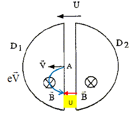 A l'intérieur des dees, règne un champ magnétique B uniforme et constant tel que B = 1,8 T. Entre les dees, il existe un champ électrique E produit par la différence de potentiel électrique U. Des deutons 21H sont injectés dans Dl en A avec une vitesse V perpendiculaire à B. Représenter la force magnétique qui s'exerce sur un deuton en A. Les deutons ont une charge positive gale à la charge élémentaire.