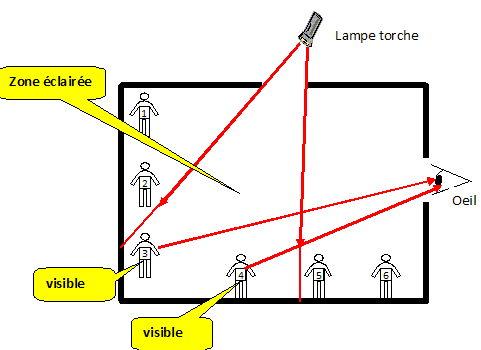 Un corps incandescent ( porté à haute temprérature ) émet une lumière visible. la Lune, les planètes, les objets éclairés sont des objets diffusants, ou des sources secondaires de lumière : Ils émettent dans toutes les directions, la lumière qu'ils reçoivent. Pour voir un objet, il faut que l'oeil en reçoive de la lumière. Pour être visible, un objet doit : - être éclairé par une source de lumière. - cette lumière émise par l'objet doit rentrer dans l'oeil, le récepteur de lumière. Un corps opaque ne laisse pas passer la lumière. Compléter les phrases avec les verbes " absorber, diffuser, émettre". Un objet noir .......... toute la lumière qu'il reçoit. Un objet blanc ............ toute la lumière qu'il reçoit. Une ampoule électrique ......... de la lumière dite "blanche". Un objet noir absorbe toute la lumière qu'il reçoit. Un objet blanc diffuse toute la lumière qu'il reçoit. Une ampoule électrique émet de la lumière dite "blanche". Un segment de droite, avec une flèche,