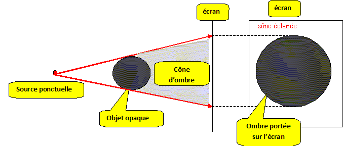 Comment se propage la lumière ? Dans un milieu transparent et homogène, la lumière se propage de façon rectiligne. Le trajet rectiligne de la lumière est modélisé par le rayon lumineux. Un segment de droite, avec une flèche, représente un rayon lumineux La flèche indique le sens de propagation de la lumière. Ombre propre. Ombre portée. Une source lumineuse ponctuelle et un objet opaque déterminent deux zones : une zone éclairée de laquelle lobservateur voit la source, une zone dombre (appelée cône dombre) de laquelle lobservateur ne voit pas la source. Une zone d'ombre est une zone non éclairée : elle est noire. L'ombre portée a la forme de l'objet.