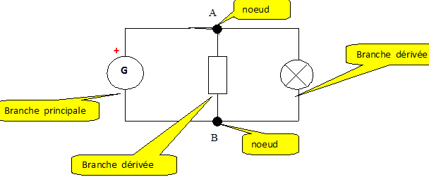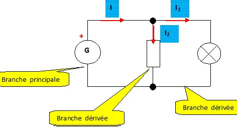 Noeud : point du circuit où au moins trois fils se rejoignent. Branche : portion d'un circuit située entre 2 noeuds. Lintensité du courant est la même en tout point dun circuit en série. Loi d'additivité de l'intensité dans un circuit comportant une dérivation. L'intensité principale est égale à la somme des intensités dérivées. I= I1 + I2.