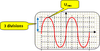 Vrai. Sensibilité verticale : 2 V/div ; sensibilité horizontale 10 ms /div. A- la valeur maximale de la tension est Umax =6 V. Vrai.
