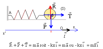 période de l'oscillateur élastique : T= 2p racine carrée (M/k) M= 0,01 kg ; k = 0,01 N/m ; T = 6,28 s. x: abscisse de G équation différentielle du