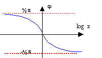 diagramme de Bode de la phase : j = -tan-1 ( Q [x- 1/x] ) recherche des asymptotes : lorsque x tend vers 0+, j tend vers +½p-; lorsque x tend vers l'infini, j tend vers -½p+ valeur particulière j(1) = 0 .