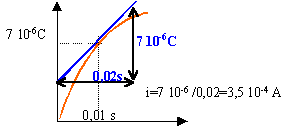 au début de la charge , qA est peu différent de zéro. En conséquence i0=E/R. D'après la courbe, la valeur finale de la charge est 10-5 C. Or qA=CUAB--> UAB=10-5 / 2 10-6 = 5V. intensité i0 : pente de la tangente à la courbe à t=0.