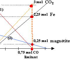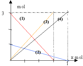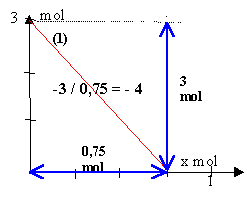 de même pour les autres droites : (2) donne -1 / 1 = -1 (3) donne : 3 / 0,75 = 4 ; (4) donne : 3/1 = 3 les valeurs absolues des coefficients directeurs correspondent aux nombres stoéchiométriques. composition initiale : produits : 0 mol réactifs :