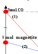 Le graphe ci dessous représente l'évolution, en fonction de l'avancement de la réaction x, des quantités de matière des réactifs et des produits d'une réaction se produisant dans le haut fourneau. Les réactifs sont la magnétite Fe3O4, le monoxyde de carbone CO; les produits sont le fer et le dioxyde de carbone.