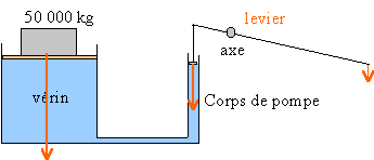 section du grand piston : R= 57 mm = 0,057 m pR² = 0,057 ² *3,14 = 0,01 m² pression (Pa) = force (N) divisée par surface (m²) 5 105 / 0,01 = 5 10 7 Pa ou 500 bars section petit piston : 3,14 * 0,009 ² = 2,5 10 -4 m² un liquide transmet intégralement toute variation de pression: le rapport des forces exercées sur les pistons est égal à l'inverse du rapport des sections rapport section : 40 force sur le petit piston : 5 10 5 / 40 = 1,25 104 N. par l'intermédiaire d'un levier on multiplie les forces dans le rapport des bras de levier rapport des bras de levier :800/30 = 26,7 rapport des forces = inverse du rapport des bras de leviers force exercée à l'extrémité du grand bras : 1,25 104 / 26,7 = 468 N.