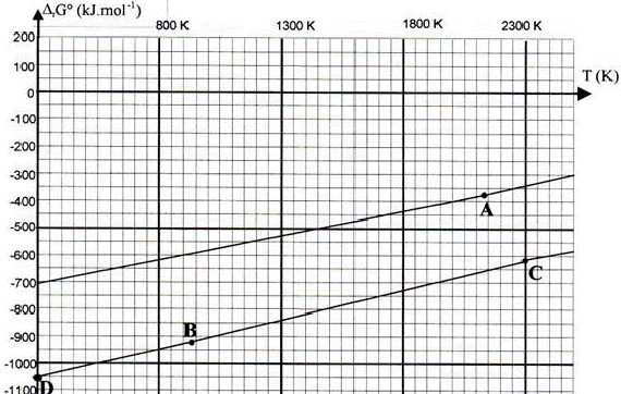 A diverses températures T, on relève les valeurs correspondantes des enthalpies libres standard DrG0 (DrHG0 et DrSG0 seront considérées indépendantes de T ) relatives aux réactions d'obtention des oxydes de cuivre (I) et (II) : Cu2O (réaction 1) et CuO (réaction 2). ( les réactions ne font intervenir qu'une mole de dioxygène ).