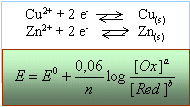 pour le cuivre : ECu = 0,34 + 0,03 log [Cu2+] pour le zinc : EZn = -0,76 + 0,03 log [Zn2+] Même si les concentrations sont très différentes les unes des autres ECu > EZn Le cuivre est l'électrode positive: les ions Cu2+ se réduisent, c'est la cathode. Le zinc est l'électrode négative: le zinc s'oxyde c'est l'anode Zn + Cu2+ -->Zn2+ + Cu fem de la pile : ECu = 0,34 + 0,03 log 0,1 = 0,31 V EZn = -0,76 + 0,03 log 0,1 =-0,79 V E = ECu -EZn = 1,1 V