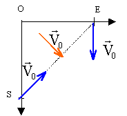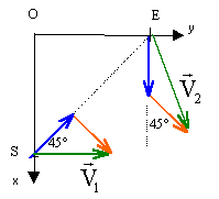 Deux oies situées initialement en E et S s'envolent au même instant, choisi comme origine des temps. ES=d. L'une se dirige vers E à la vitesse V0, l'autre se dirige plein sud à la vitesse V0. Les oies gardent le même cap durant tout le vol. Le vent souffle à vitesse constante V0 en direction du sud est (perpendiculairement à SE)