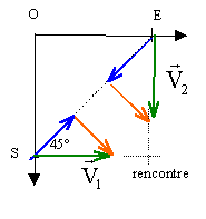 - Quelle doit être la vitesse de l'oiseau E, afin que les oies se rencontrent à la date calculée précédemment. vitesse de l'oie E pour que les oiseaux se rencontrent à t = d/ (2V0) l'oie S est au point de la rencontre : x1 = 0,707 d y1 = 1,414 V0t = 1,414 V0*d /(2V0) =0,707 d l'oie E est au point de la rencontre : x2 = x1 = Vx t = Vx d/ (2V0)=0,707 d d'où Vx = 1,414V0. y2 = y1 = Vy t + 0,707 d = Vy d/ (2V0) + 0,707 d= 0,707 d d'où Vy = 0 Le cap de l'oiseau sera de E vers S et sa vitesse V0.