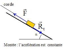 Question relative à Rn perpendiculaire au plan. Ecrire la seconde loi de Newton suivant un axe perpendiculaire au plan : -mg cos a + Rn = 0 ; Rn = mg cos a. A.N : m =40 kg ; a = 30° ; Rn = 40*10*cos 30 = 346 N. Question relative à F ou à l'acélération a. Ecrire la seconde loi de Newton suivant un axe parallèle au plan : F - mg sin a -Rt = ma. a = (F-Rt ) / m -g sin a. F = Rt + m(a+g sin a). si F = 500 N alors a =(500-100)/40 -10 sin 30 =