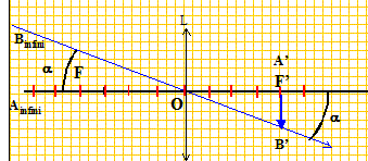 L'objet étant à l'infini, son image se trouve dans le plan focal image. exprimé 3 degrés en radians : a=3*3,14 / 180 = 5,23 10-2 rad. tan a = A'B' / OF' vosin de a radian pour les angles petits. hauteur de l'image (m) = a (radian)* distance focale(m) distance focale (m) = inverse de la vergence en dioptries = 1/20 = 0,05 m hauteur image = 5,23 10-2 *0,05 = 2,6 10-3 m = 2,6 mm.