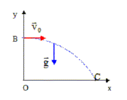 Question relative à la distance OC. Au point C, y=0 soit xC2 = 2v02H/g. xC2 =2*15,82*2/10 = 100 ; xC= 10 m. Question relative à la durée de la chute. xC = v0t ; t = xC / v0 = 10/15,8 =0,63 s. ou bien : yC=0 ; -0,5g t2+H=0 ; t2=2H/g ; t = (2H/g)½ = (2*2/10)½ =0,63 s.